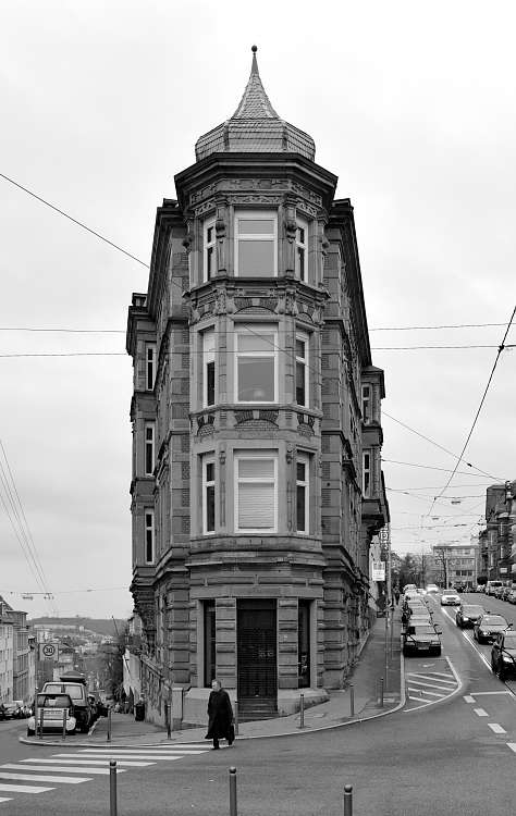 : Eines der wenigen alten Stadthäuser, das der Krieg uns gelassen hat. Das vierstöckige Haus aus dem Jahr 1891 schiebt sich wie ein Keil zwischen die Haußmannstraße und die Kernerstraße.